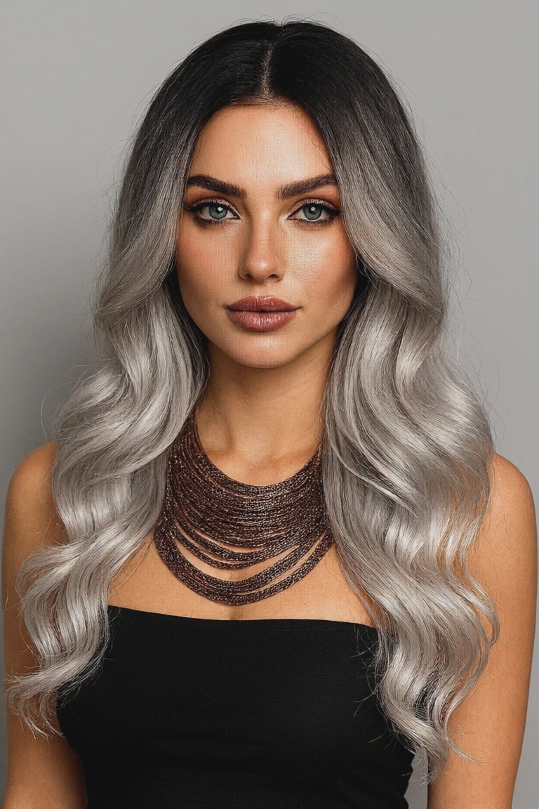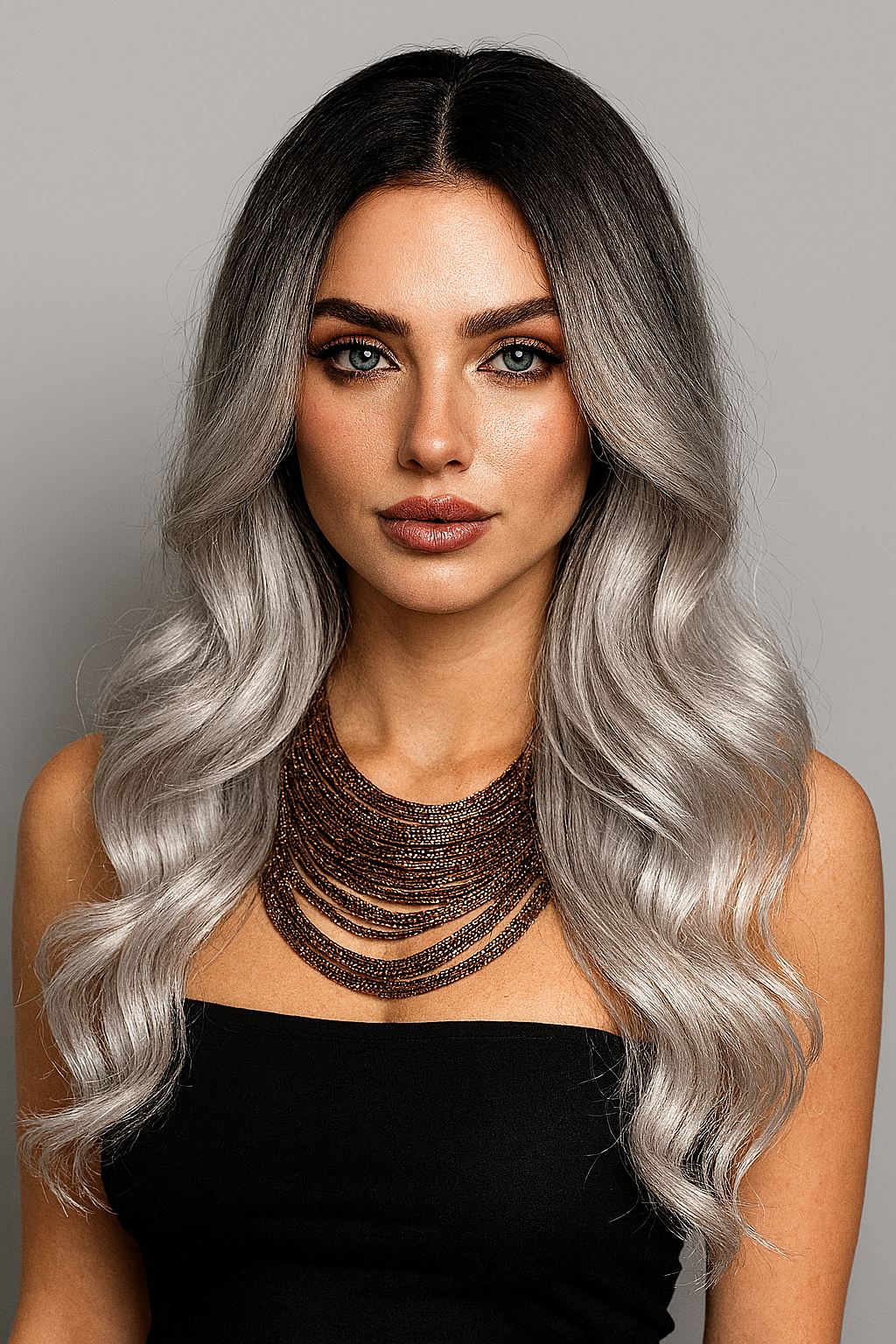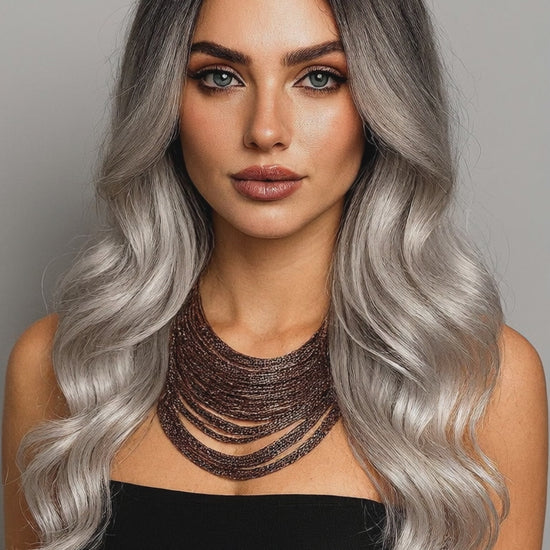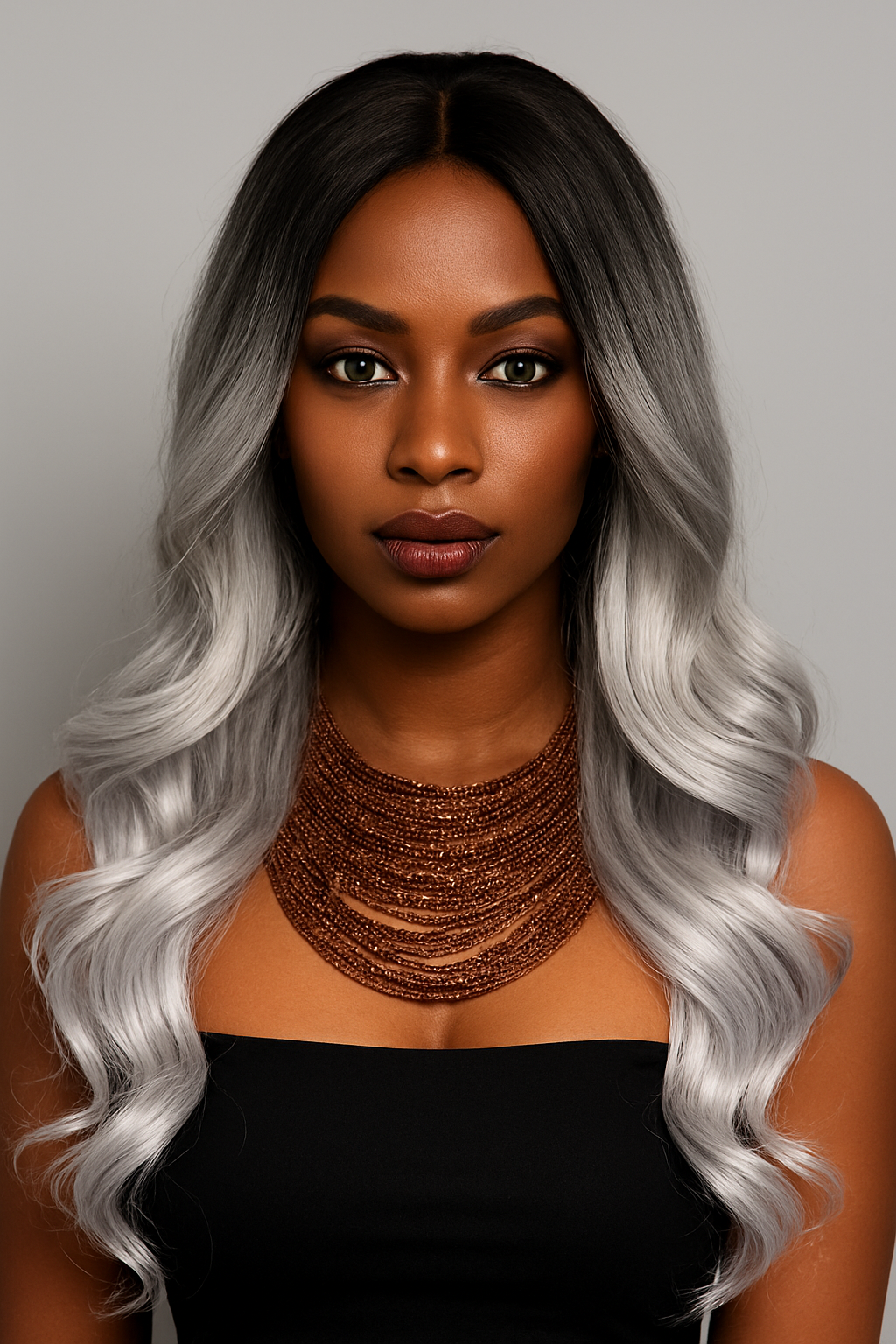 This 26-inch Viper’s Kiss Crown features an ombré grey body wave lace front design, blending deep, dark roots into shimmering silver ends for an exotic, high-glam look. Made from heat-resistant synthetic fibers, it’s soft, tangle-resistant, pre-plucked for a natural hairline, and completely glueless for all-day comfort. Perfect for everyday wear, cosplay, or special occasions.